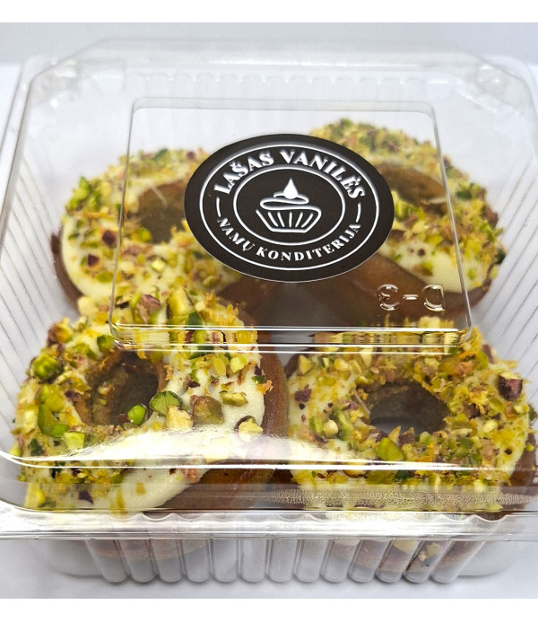 Šios spurgos pagamintos iš migdolų ir pistacijų riešutų bei moliūgų sėklų miltų mišinio, gardintos citrina ir papuoštos baltuoju šokoladu su kapotomis pistacijomis ir citrinos žievele. Aromatingos ir net kelias dienas išlaikančios drėgnumą spurgos yra keptos orkaitėje, pilnos baltymų, be glitimo.